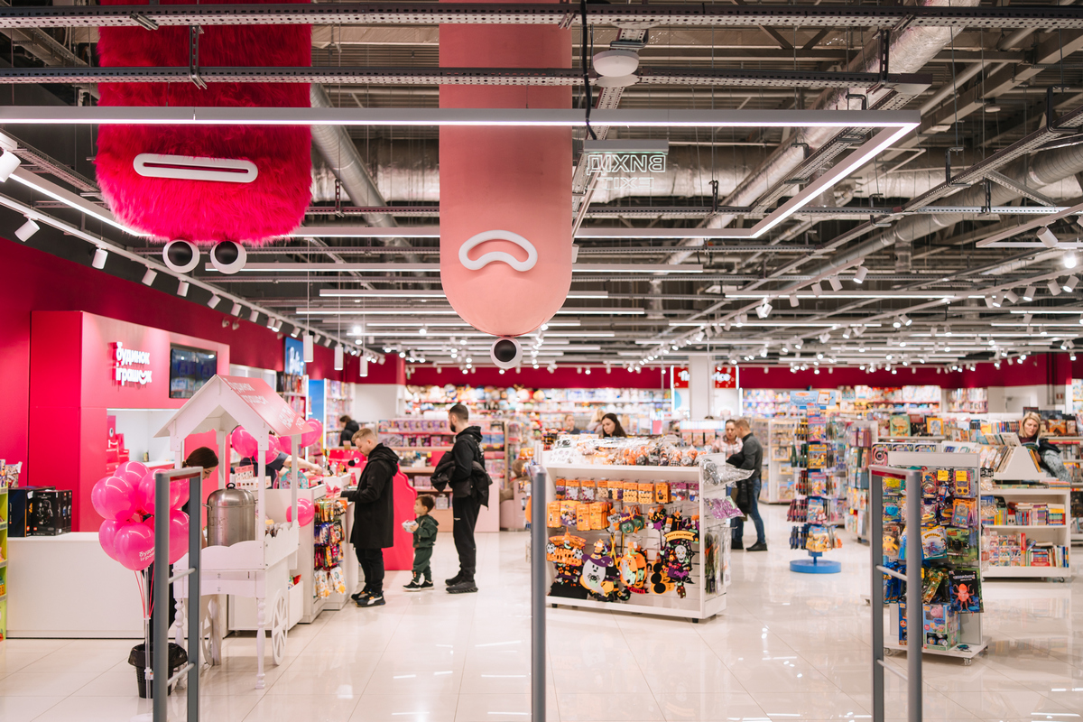 Загальна площа магазину 1161 кв. м. Простір отримав оновлений дизайн та низку інтерактивних зон: великий острів із бізібордами, геймінг-зону з PlayStation, трек Hot Wheels, зону для гри з Barbie, тематичні фотозони та інсталяції з фігурками популярних персонажів.