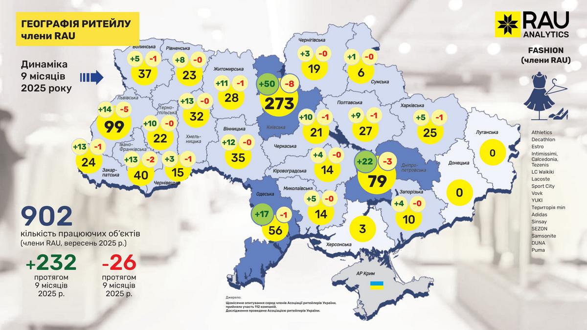 Як показало регулярне щомісячне опитування RAU, проведене серед 112 членів Асоціації ритейлерів, станом на жовтень 2025 року в них працювало 24 178 магазинів у семи основних галузях ритейлу. Мова йде про продовольчий і непродовольчий ритейл, fashion, а також продавців техніки й електроніки, мережі АЗК, магазини з продажу ювелірних виробів та сегмент DIY-мереж. За січень-вересень 2025 року ритейлери загалом відкрили 1658 магазинів і закрили 534. Таким чином українські торгівельні мережі розширилися на 1124 торгових об’єкти.