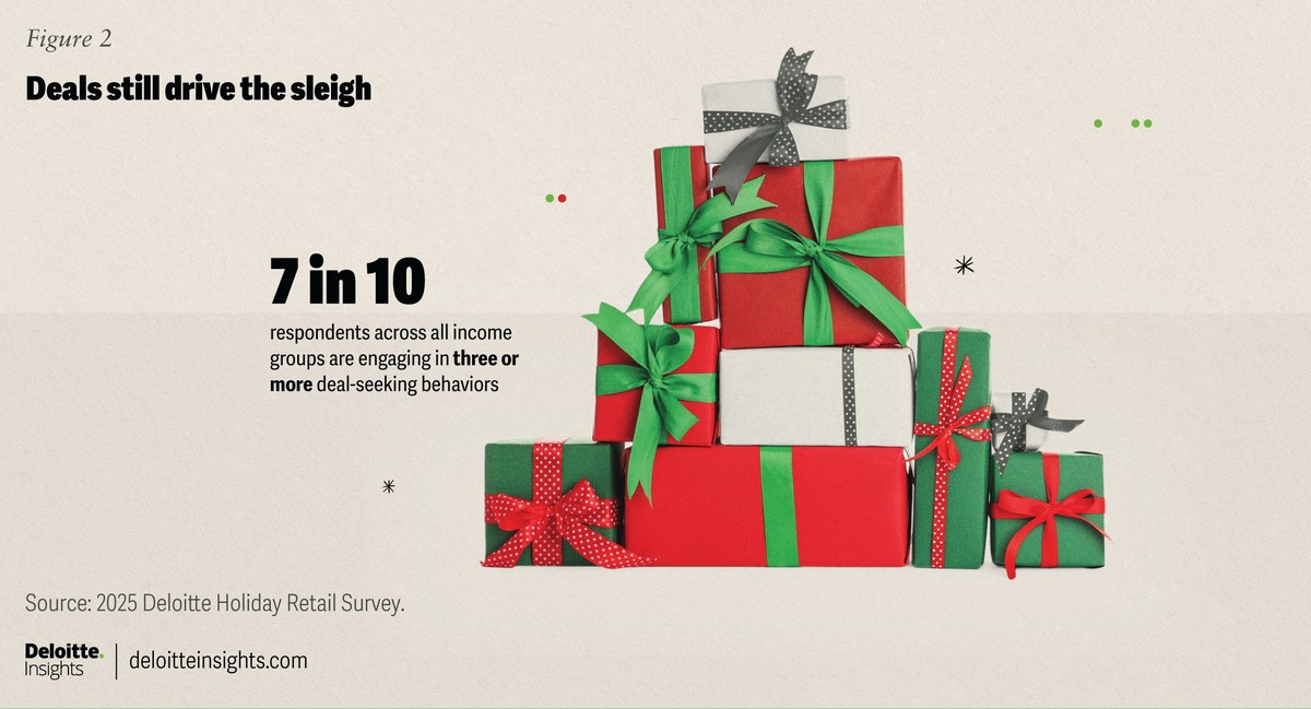 Згідно з даними дослідження Deloitte про роздрібну торгівлю у святковий період 2025 року, покупці, рятуючись від економічної невизначеності, звертаються до знижок, цифрових зручностей та сезонних заходів, щоб зберегти гарний настрій.