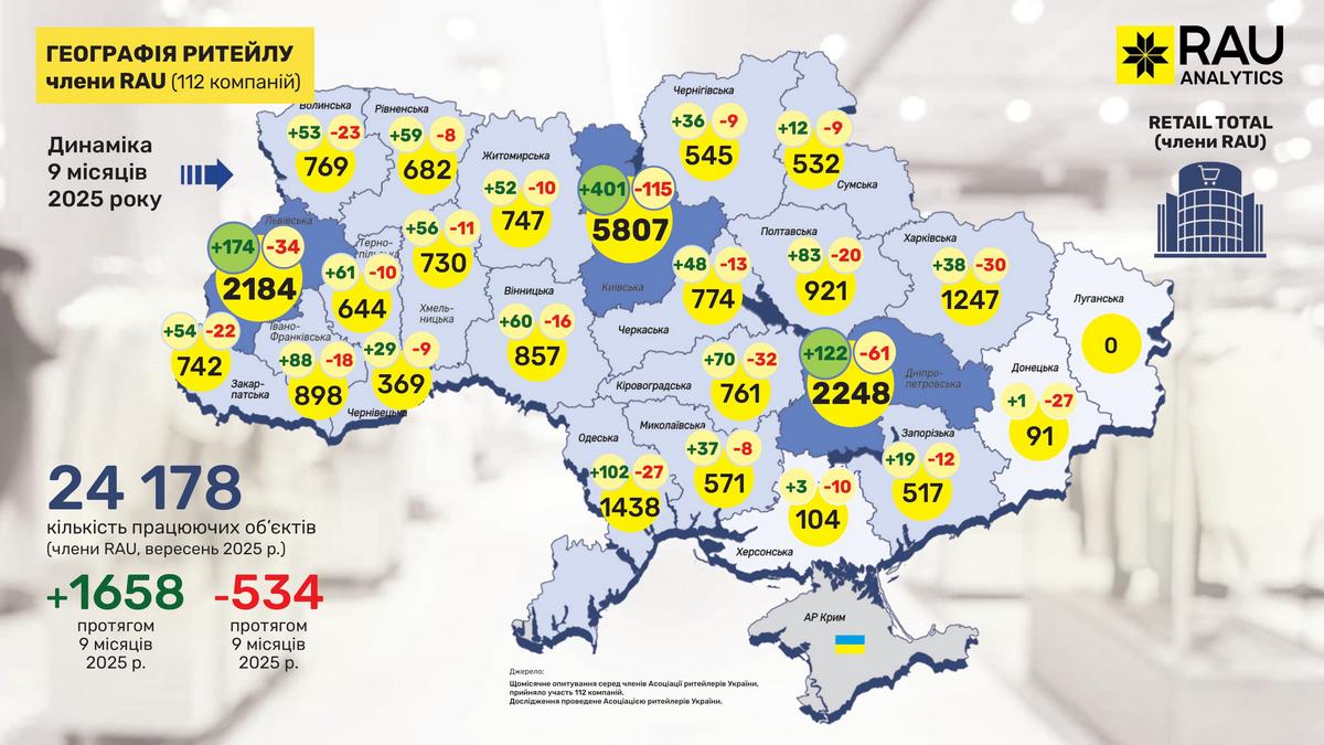 Як показало регулярне щомісячне опитування RAU, проведене серед 112 членів Асоціації ритейлерів, станом на жовтень 2025 року в них працювало 24 178 магазинів у семи основних галузях ритейлу. Мова йде про продовольчий і непродовольчий ритейл, fashion, а також продавців техніки й електроніки, мережі АЗК, магазини з продажу ювелірних виробів та сегмент DIY-мереж. За січень-вересень 2025 року ритейлери загалом відкрили 1658 магазинів і закрили 534. Таким чином українські торгівельні мережі розширилися на 1124 торгових об’єкти.