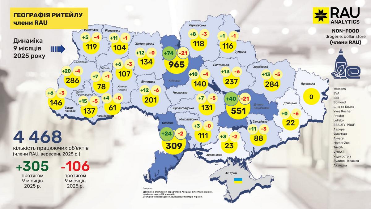Retail Association of Ukraine представляє чергове ексклюзивне аналітичне дослідження під назвою “Географія ритейлу”. На основі даних мереж, які є членами RAU, була зібрана та узагальнена інформація про те, як змінилася географія ритейлу за 9 місяців 2025 року, та яка динаміка розвитку галузі по регіонам.