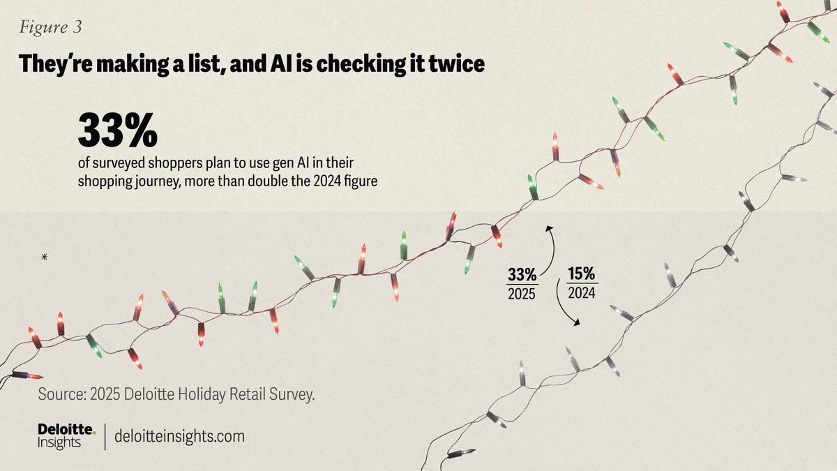 Використання споживачами технологій штучного інтелекту показує, що їх очікування зміщуються у бік персоналізації та ефективності. Покупці тепер очікують миттєвих рекомендацій, адаптованих до їх побажань, бюджету та самих одержувачів (вигляду, комплекції тощо), що підвищує планку для цифрової взаємодії ритейлерів. Щоб виправдати очікування покупців у святковий період, ритейлери могли б розглянути можливість впровадження AI -інструментів для пошуку подарунків, помічників зі стилю або помічників з найвигіднішої покупки безпосередньо до своїх сайтів або додатків.